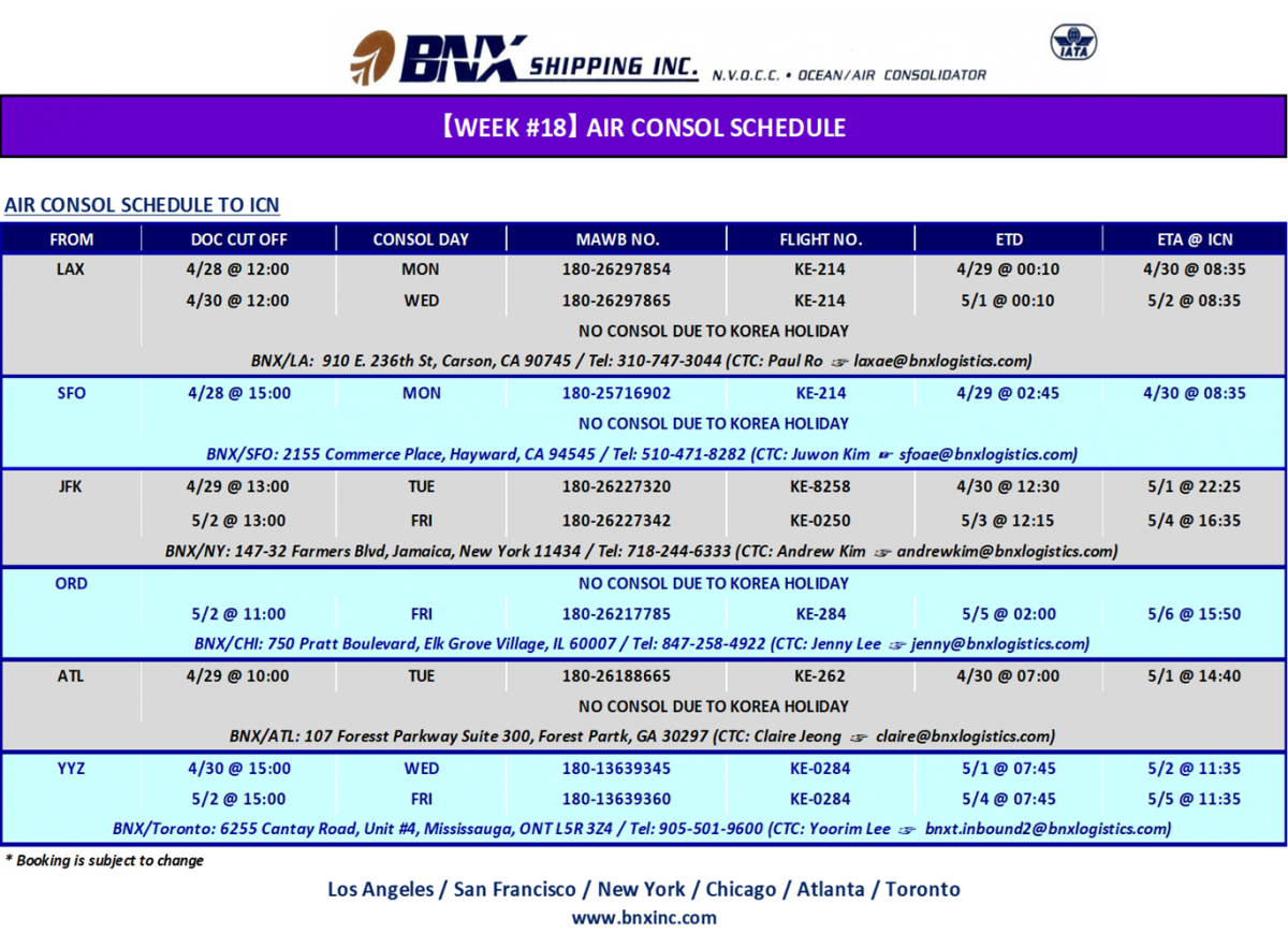 BNX Air & Ocean Consol Schedule 【Week 18】 Page Info Writer BNX Date25-04-30 10:53 View1,239Times Reply0 link Prev Next List Content Dear Valued Customers,Please kindly find below BNX Air Consol & Ocean FAK schedule for Week 18 of 2025. Please feel free to contact me if you need any further assistance.Thank you. 댓글목록 등록된 댓글이 없습니다. Prev Next List