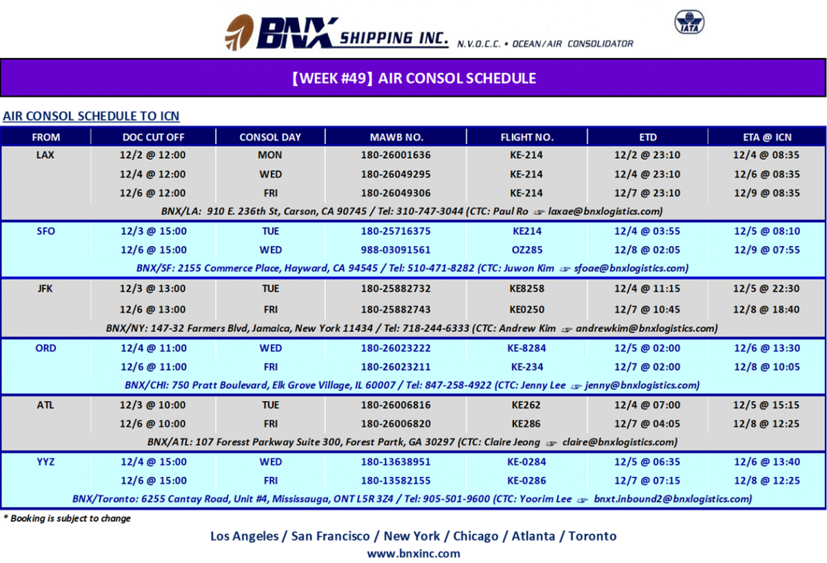BNX Air & Ocean Consol Schedule 【Week 49】 Page Info Writer BNX Date24-12-02 11:21 View1,531Times Reply0 link Prev Next List Content Dear Valued Customers,Please kindly check below BNX Air Consol & Ocean FAK schedule for Week 49 of 2024. If you need any further assistance, please feel free to contact me. Thank you. 댓글목록 등록된 댓글이 없습니다. Prev Next List