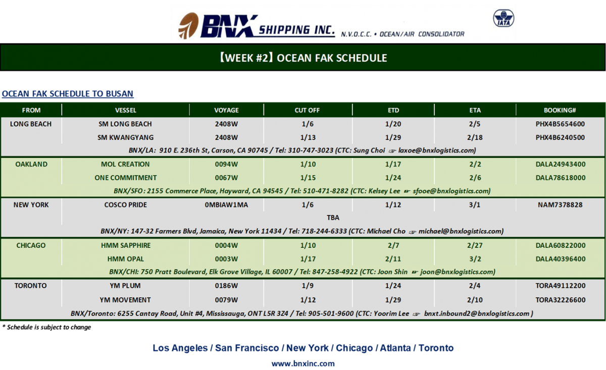 BNX Air & Ocean Consol Schedule 【Week 2】 Page Info Writer BNX Date25-01-06 11:40 View1,519Times Reply0 link Prev Next List Content Dear Valued Customers,Please kindly check below BNX Air Consol & Ocean FAK schedule for Week 2 of 2025. If you need any further assistance, please feel free to contact me.Thank you. 댓글목록 등록된 댓글이 없습니다. Prev Next List