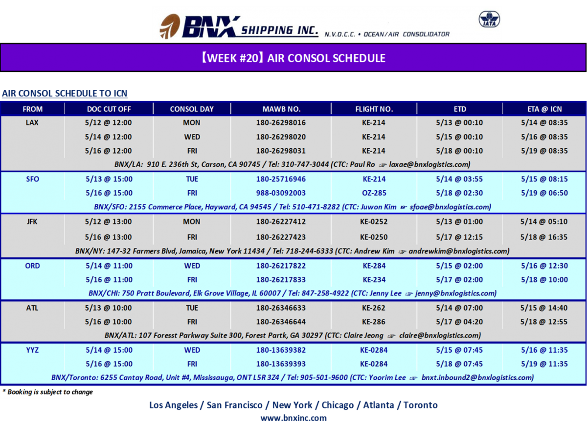 BNX Air & Ocean Consol Schedule 【Week 20】 Page Info Writer BNX Date25-05-12 10:50 View1,227Times Reply0 link Prev Next List Content Dear Valued Customers,Please kindly find below BNX Air Consol & Ocean FAK schedule for Week 20 of 2025. Please feel free to contact me if you need any further assistance.Thank you. 댓글목록 등록된 댓글이 없습니다. Prev Next List
